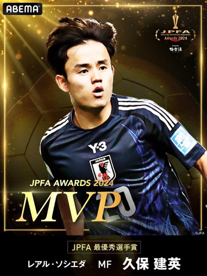 日本职业球员工会官方消息,久保建英荣获年度最佳球员奖项。