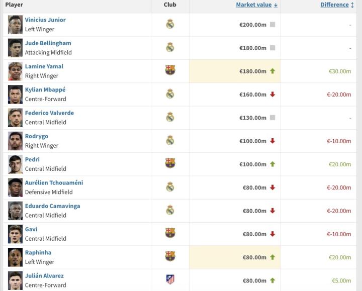 北京时间12月27日,德国转会市场更新了西甲球员的身价。其中,维尼修斯2亿欧身价领跑西甲球员身价榜。