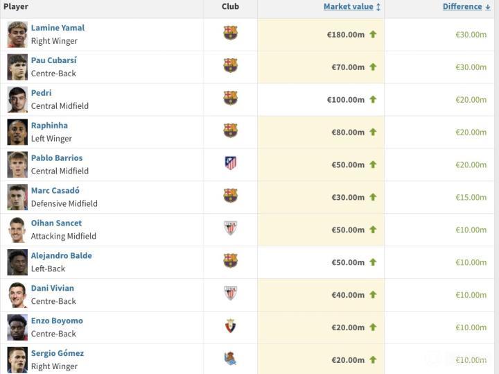 今天,德国转会市场更新了西甲球员的身价。其中,亚马尔、库巴西的身价增长了3000万欧,为本期西甲球员身价涨幅榜第一。