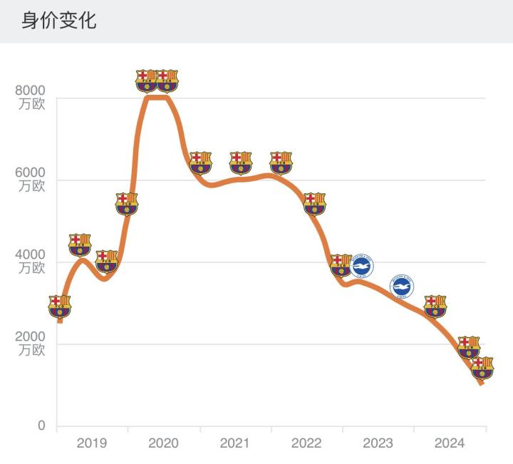 在刚刚代表巴塞罗那一线队出战时,法蒂曾闪耀全世界,他的身价一度达到过8000万欧元,而且那时他仅有17岁。不过由于伤病影响,这名巴萨10号的身价不断下跌。
