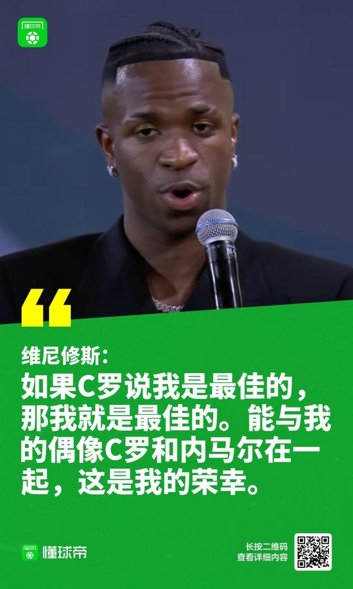 在维尼修斯获奖后,C罗曾说道:“金球奖不公平,维尼修斯本该获得,我当所有人面这么说。”