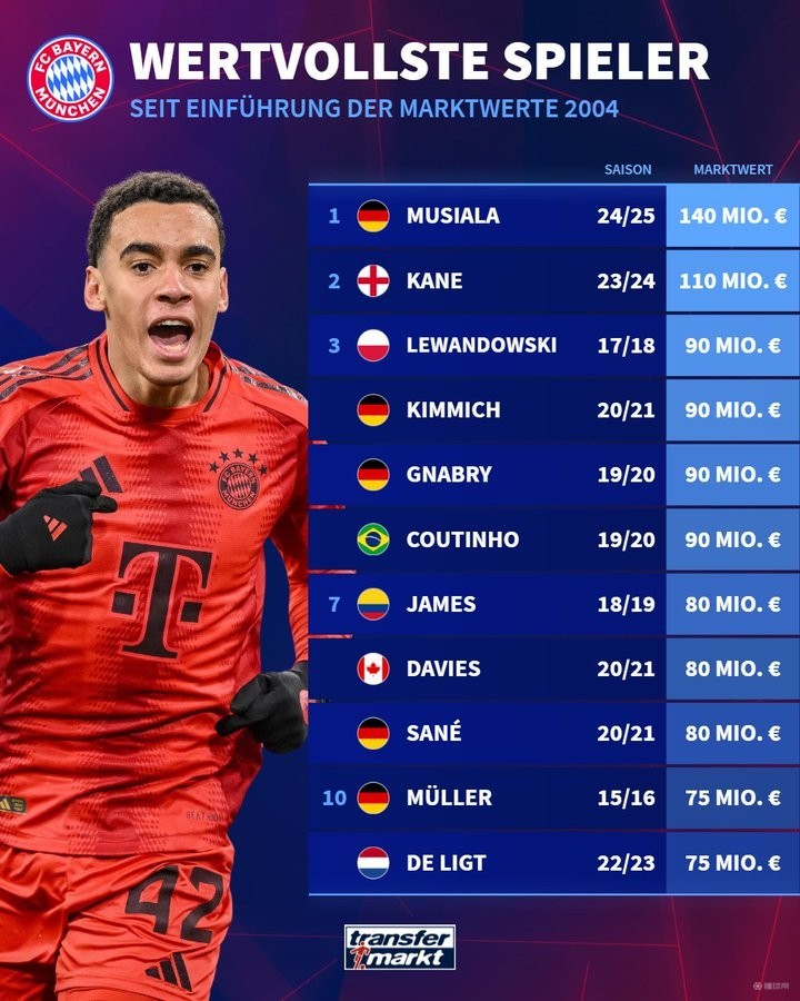 12月27日,德国转会市场列出了自2004年他们开始统计以来,拜仁球员的最高身价纪录,其中穆西亚拉以1.4亿欧元的纪录居首,凯恩排名第二,莱万排名第三。