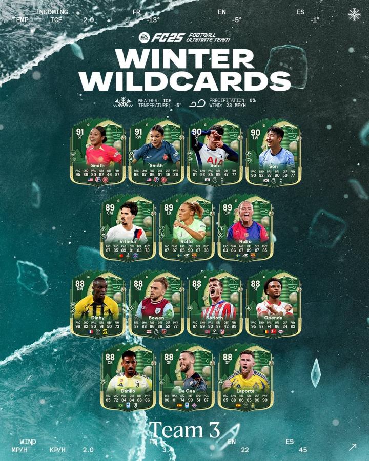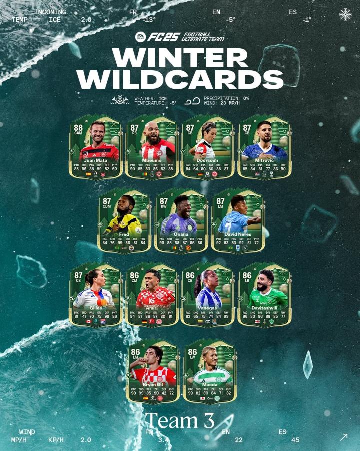 《FC25》刚刚上线了冬野团队3,其中5花金搓射右边锋奥纳纳等在列,德赫亚回归。