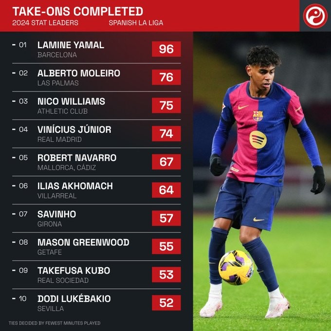 根据统计,2024年,亚马尔在各项赛事中完成了96次过人,比任何其他西甲球员都多。