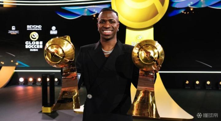 在2024年环球足球奖颁奖典礼上,皇马前锋维尼修斯获得年度最佳前锋奖和年度最佳男足球员奖,并发表感言。