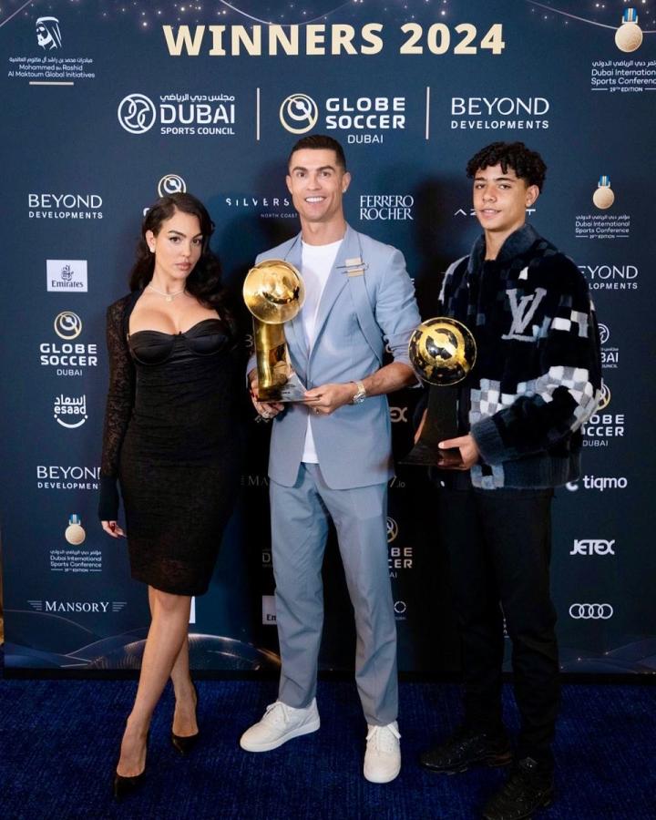 在2024年环球足球奖颁奖典礼上收获两个奖项后,C罗在社交媒体晒出他和女友乔治娜、大儿子迷你罗的合照。