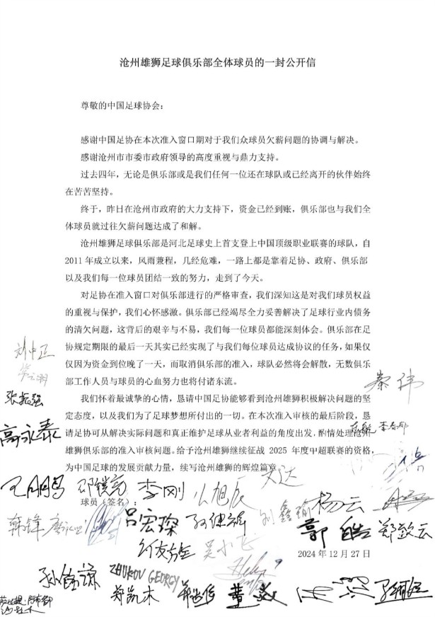 据该媒体人消息,沧州雄狮俱乐部已经跟沧州市和石家庄市两地政府达成一致,目前政府层面的6000万资金也走完了流程,也是因为有了这笔资金和已经确定的后续资金,俱乐部才与球员在还欠薪的问题上达成一致。