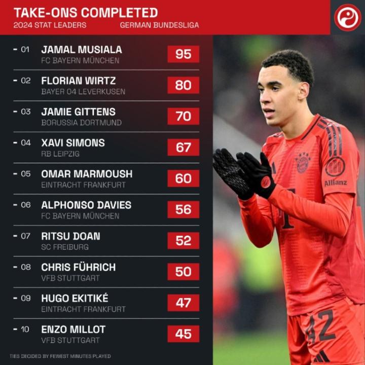 德甲上半程在上周末结束,数据机构盘点了2024年度德甲过人数据,穆西亚拉完成95次过人,高居榜首。
