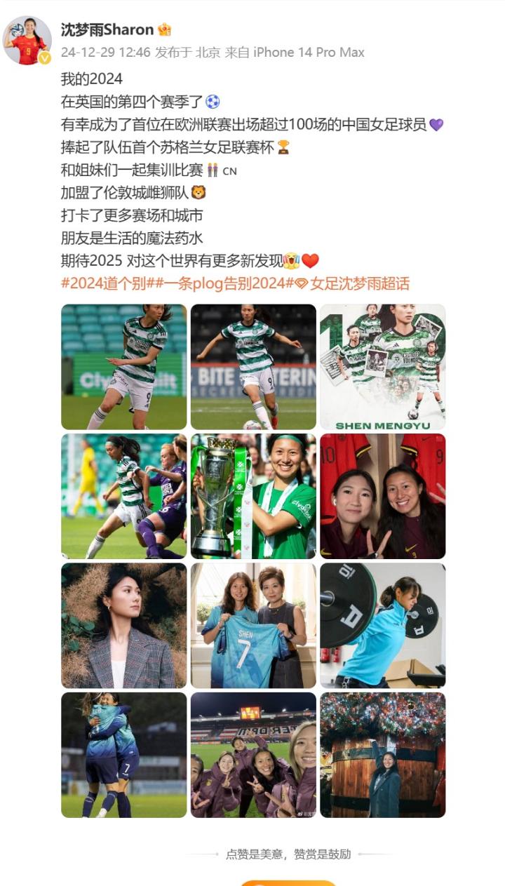效力于英女冠伦敦雌狮女足的中国女足国脚沈梦雨在微博发文告别2024年。