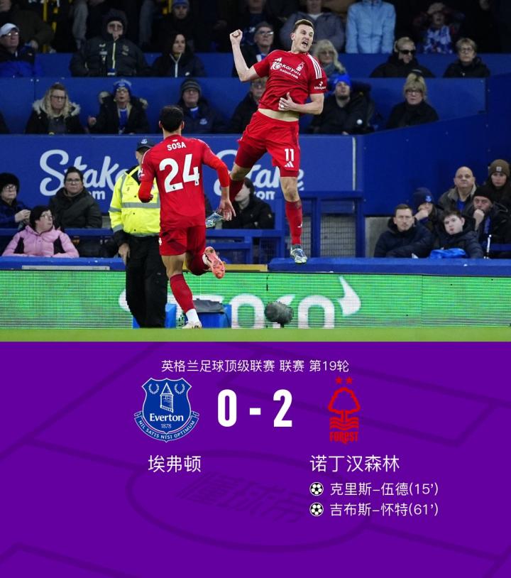 森林2-0客胜埃弗顿暂升第二,伍德传射,吉布斯-怀特建功