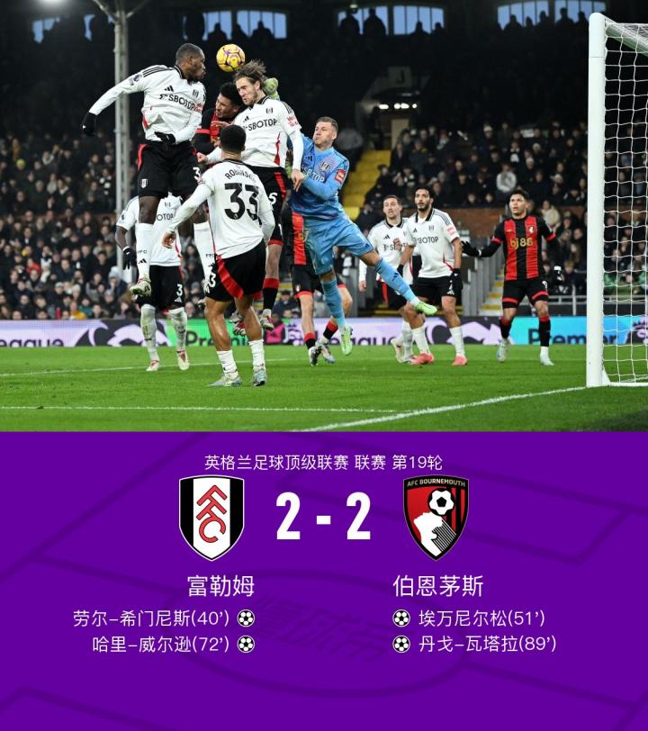 富勒姆2-2伯恩茅斯,哈里-威尔逊破门,丹戈-瓦塔拉绝平
