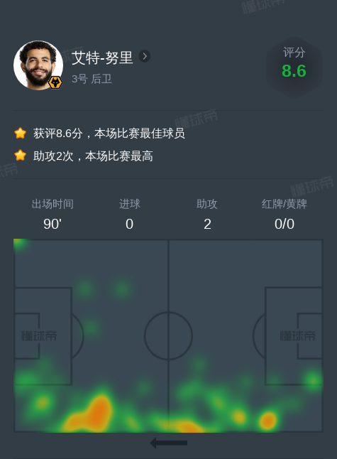 北京时间12月29日托特纳姆热刺vs狼队,艾特-努里2助攻,3次关键传球,1次射门,1次成功过人。