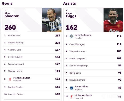目前,萨拉赫以81次助攻排名英超历史助攻榜第十,在英超历史进球榜上,萨拉赫以174球排名第八。