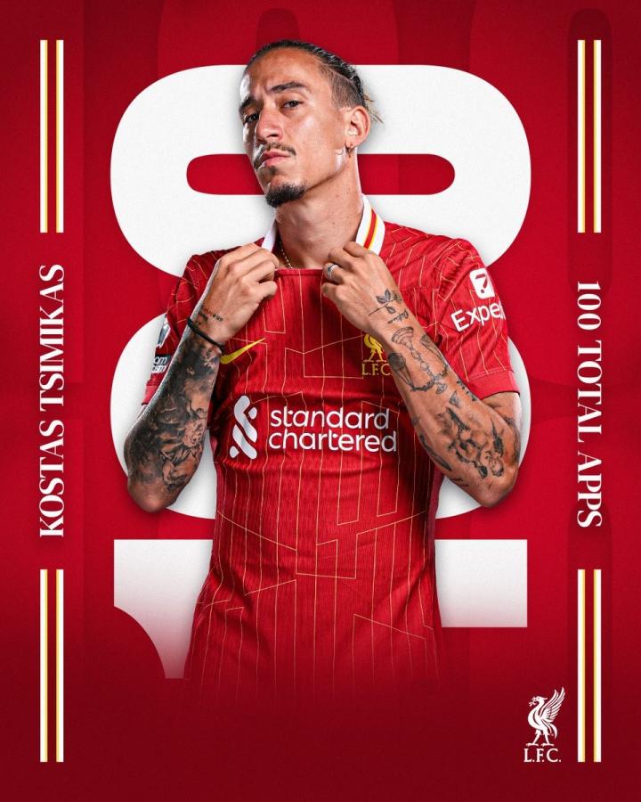 此役英超客场对阵西汉姆联,齐米卡斯在比赛第74分钟替补登场,换下罗伯逊,这位希腊后卫迎来利物浦生涯各项赛事第100次出场。