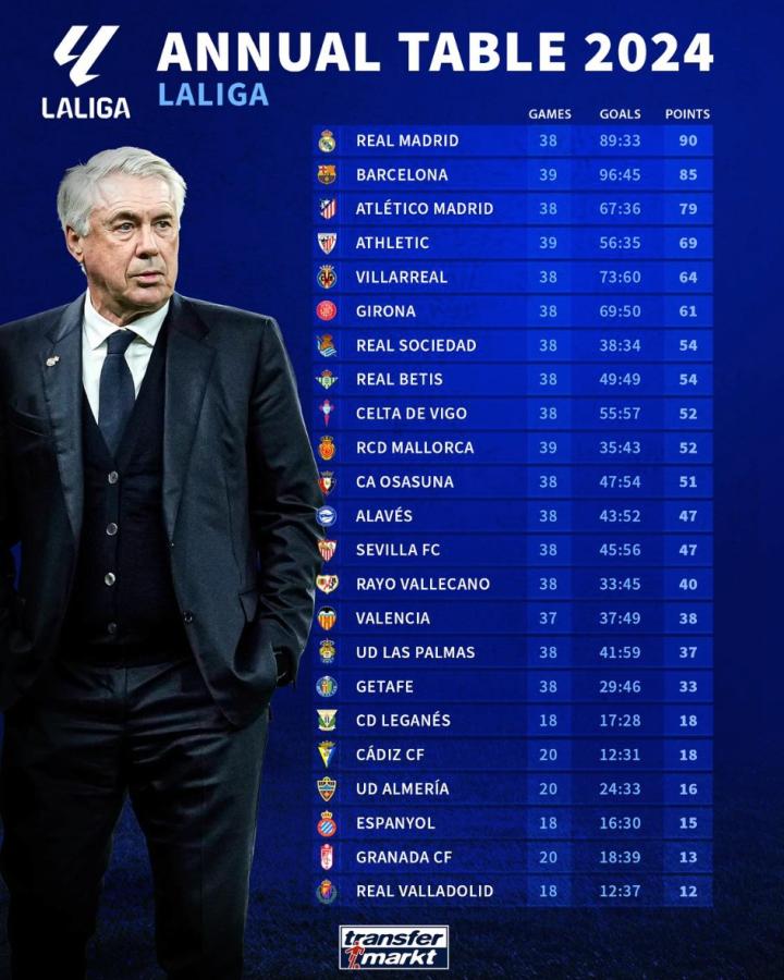 德转统计出了西甲2024年的积分榜,皇家马德里以38战90分的成绩位列第一,巴塞罗那39战85分排名第二,马德里竞技38战79分位列第三。