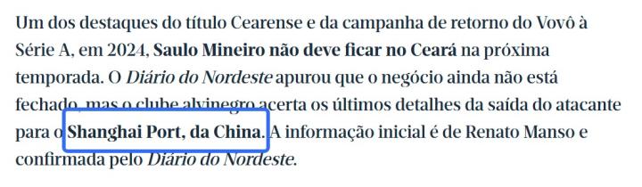 据巴西媒体diariodonordeste消息,塞阿拉前锋米内罗接近加盟海港,双方正在确定最终细节。但此前国内记者消息称米内罗是申花新援。
