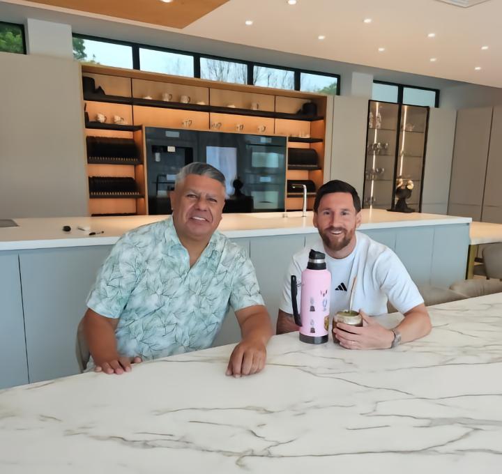 当地时间12月30日,阿根廷足协主席塔皮亚在社交媒体晒出他和梅西的合照,照片中梅西拿着他的马黛茶杯,面前还放着一个粉色的水壶。