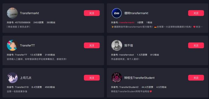 各个短视频平台上,搜索“转会市场”“德转”“德国转会市场”“Transfermarkt”等类似名字可以搜到一些账号,大家请注意辨别,也有部分账号写着德转名字卖足彩等。