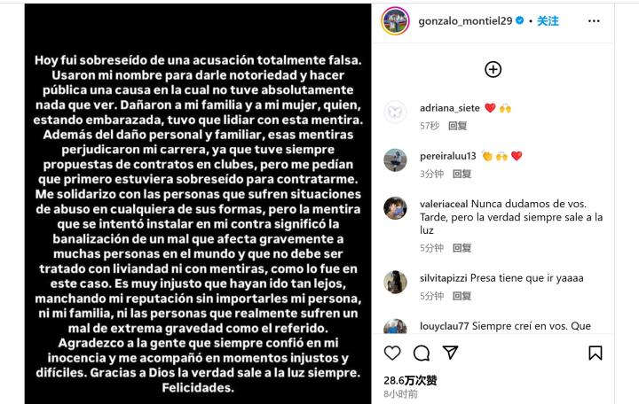 今日,阿根廷球员蒙铁尔针对自己涉嫌性侵的案件发布公告,表示自己已经被无罪释放,罪名完全是诬告。他强调,这件事不仅损害了自己的家人和职业生涯,还让真正应该被关注的邪恶被一笔带过。