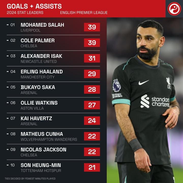 据统计,萨拉赫与帕尔默并列成为了在2024年的英超联赛当中直接参与进球数量最多的球员。