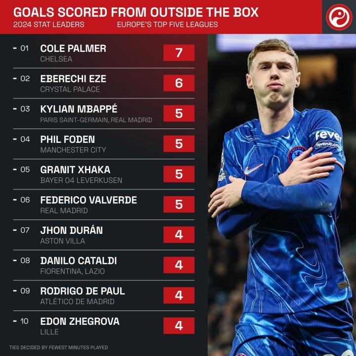 据统计,切尔西中场帕尔默是2024年欧洲五大联赛当中从禁区外破门次数最多的球员。