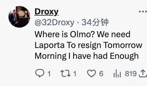 在巴萨官方祝福球迷们新年快乐的动态下,有巴萨球迷回复到:“奥尔莫在哪里?我们需要拉波尔塔明天早上辞职,我受够了”、“奥尔莫呢?”