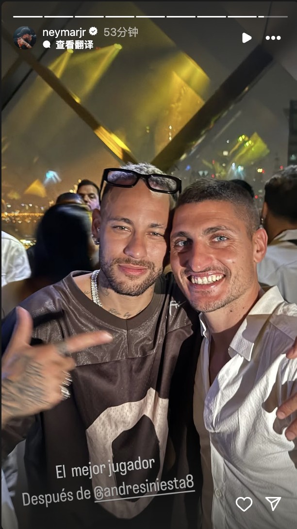 内马尔和维拉蒂一起参加了跨年活动。北京时间今天早晨,内马尔在社媒晒出二人合照,并写道:“伊涅斯塔之后最棒的(中场)球员,维拉蒂。”