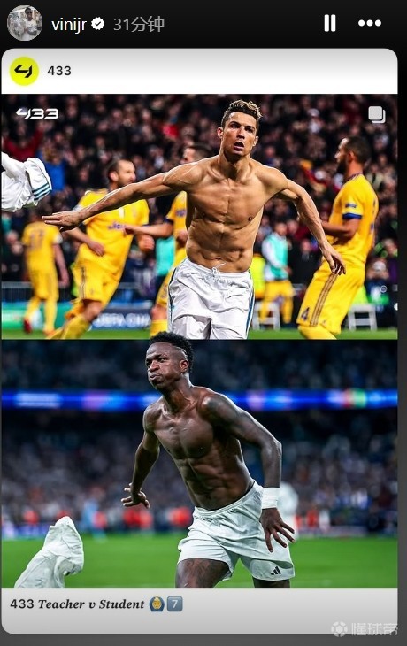 今天,皇马球星维尼修斯在个人社交媒体转发了自己和C罗同款脱衣庆祝图。