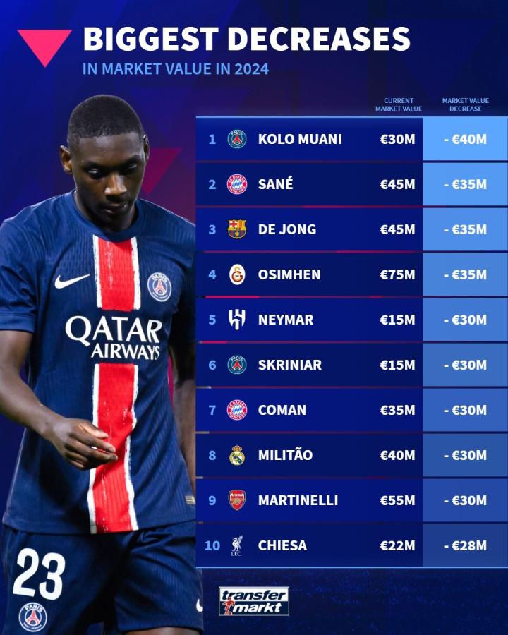 2024年已经过去,德国转会市场网站列出了2024年球员身价下跌榜,巴黎前锋穆阿尼下跌4000万欧最多,萨内、德容、内马尔等人上榜。