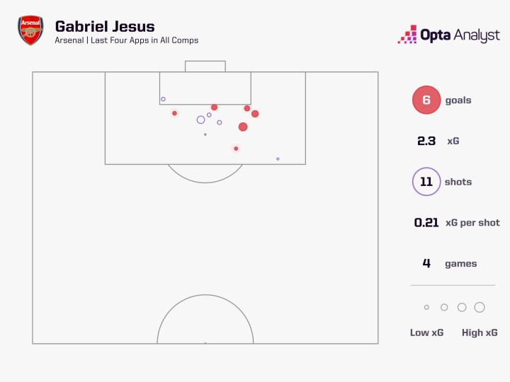 热苏斯在近期展现出了非常出色的状态和极其高超的效率,目前他在近4场比赛中已经取得了6个进球,而他打进这6个进球只用了11次射门。