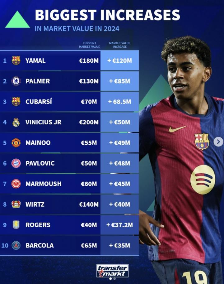 北京时间1月1日凌晨,德国转会市场列出了2024年球员身价上涨榜。其中,亚马尔上涨1.2亿欧居首,帕尔默上涨8500万欧第二。