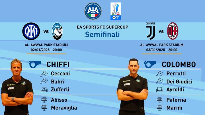 意大利的裁判员协会公布了意大利超级杯两场半决赛的裁判名单,达尼埃莱-齐菲将会执法国际米兰vs亚特兰大,安德烈亚-科隆博执法尤文图斯vsAC米兰。