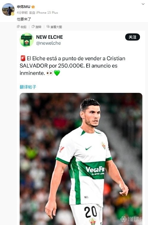 埃尔切后腰克里斯蒂安-萨尔瓦多要加盟天津津门虎?《天津日报》记者申炜晒出国外博主爆料克里斯蒂安-萨尔瓦多即将转会的截图并写道:“他要来了。”