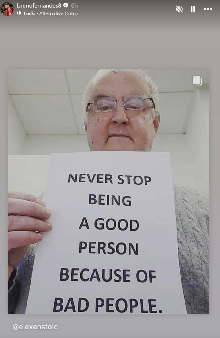 布鲁诺-费尔南德斯在社交媒体上转发了一条动态,一个老人拿着一张纸,上面写的是:“永远不要因为坏人而停止做一个好人。”