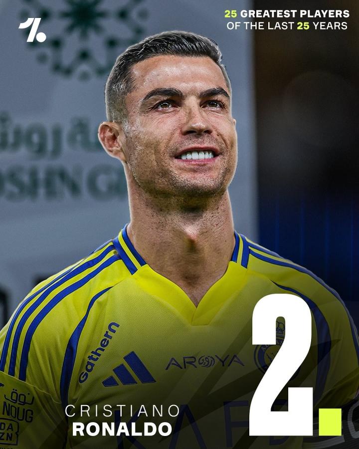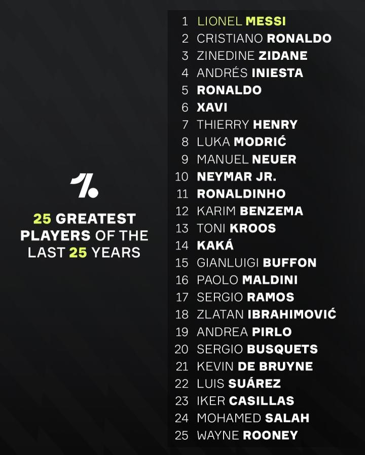 当地时间1月1日,著名足球媒体onefootball(在社媒拥有千万粉丝)评选了该21世纪前25年的25大球员排名。其中梅西排名第一,C罗第二,大罗第五,小罗第十一,姆巴佩、莱万多夫斯基等巨星则无缘榜单。