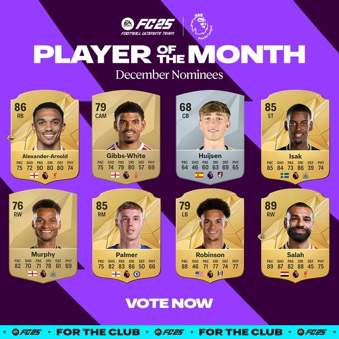 北京时间1月2日,英超官方公布了12月最佳球员的候选名单,其中阿诺德、伊萨克、帕尔默、萨拉赫在列。