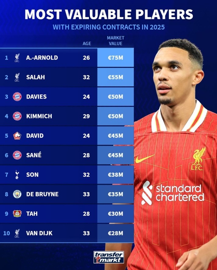 阿诺德以7500万欧元稳居榜首,萨拉赫以5500万欧元排名第二,阿方索-戴维斯以5000万欧元排名第三。