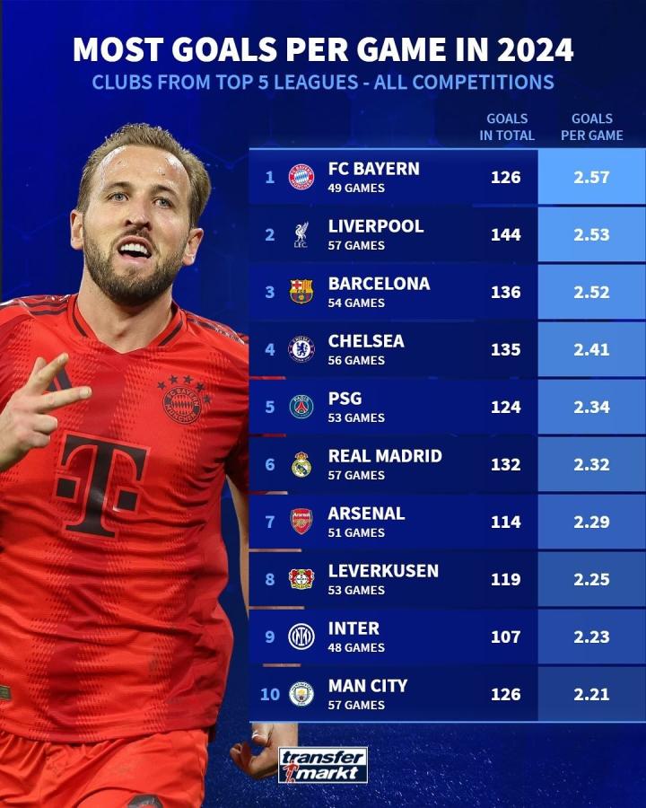 2024年已经过去,德国转会市场网站列出了五大联赛球队2024年各项赛事场均进球数排行,拜仁以2.57球居首,利物浦以2.53球排名第二,巴萨以2.52球位列第三。