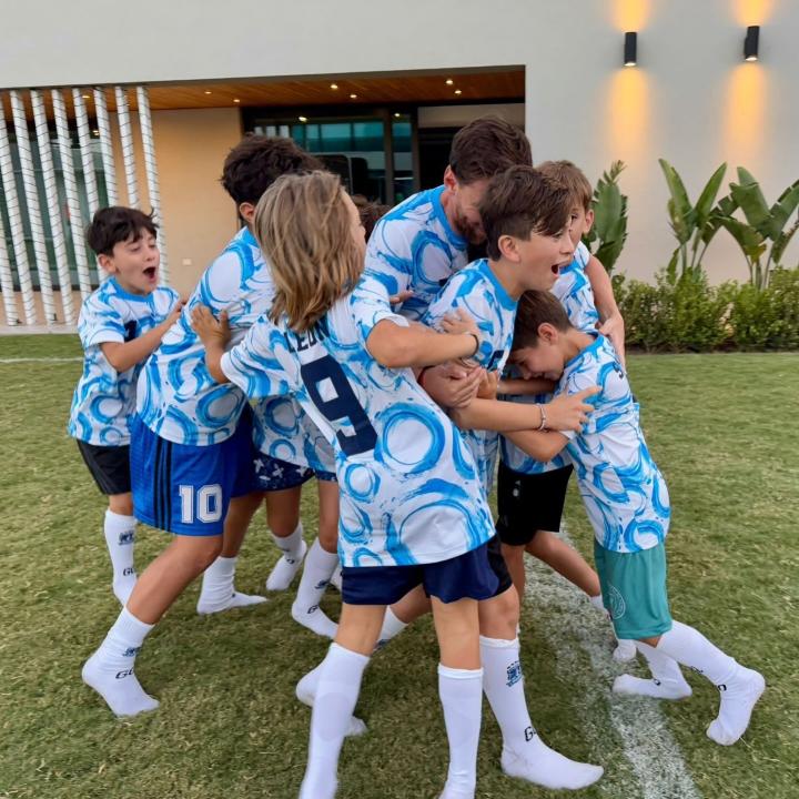 梅西在社交媒体晒出他和小朋友们一起踢球的照片,其中包括他的三个儿子蒂亚戈-梅西、马特奥-梅西和西罗-梅西。