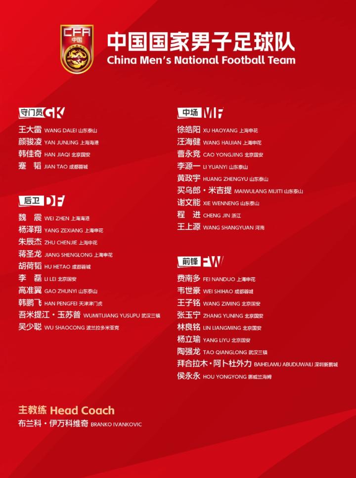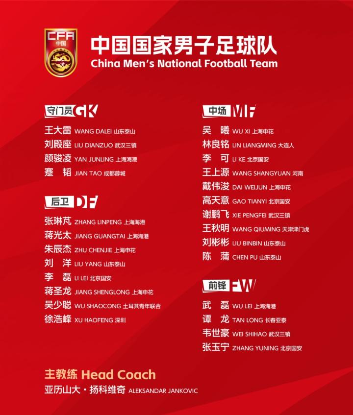 2025年1月,国足公布今年的首期集训名单,32名球员入选,与去年年初的亚洲杯名单相比,只有颜骏凌、朱辰杰、蒋圣龙、蹇韬、李磊、张玉宁、王大雷、王上源、吴少聪等9名球员还在大名单内。
