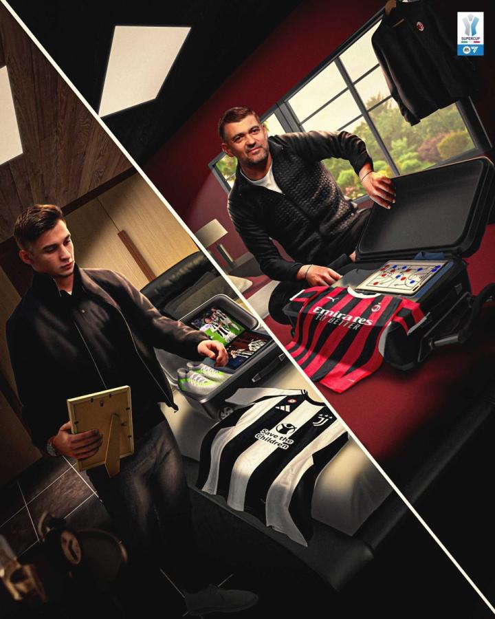 意大利超级杯半决赛,尤文图斯将对阵米兰,赛前,意甲官方发布海报预热孔塞桑父子对决。