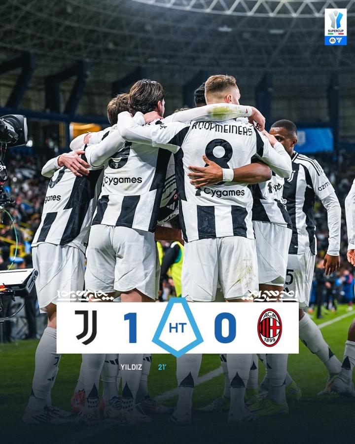 在意大利超级杯的第二场半决赛里,尤文图斯在半场过后1-0领先于AC米兰,凯南-伊尔迪兹开场第20分钟禁区内右侧爆射打破场上僵局。
