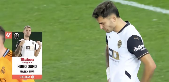 西甲第12轮补赛,瓦伦西亚主场1-2遭皇家马德里逆转,此役为瓦伦西亚首开记录的杜罗当选西甲官方全场最佳球员。