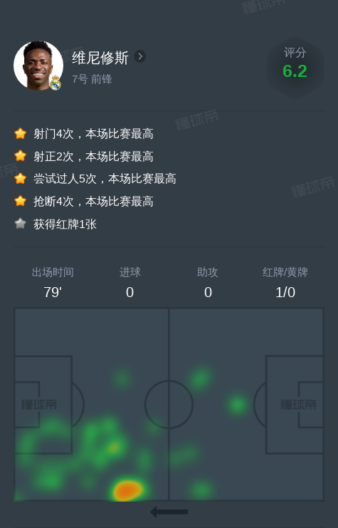 北京时间1月4日瓦伦西亚vs皇家马德里,维尼修斯4次射门,1次成功过人。