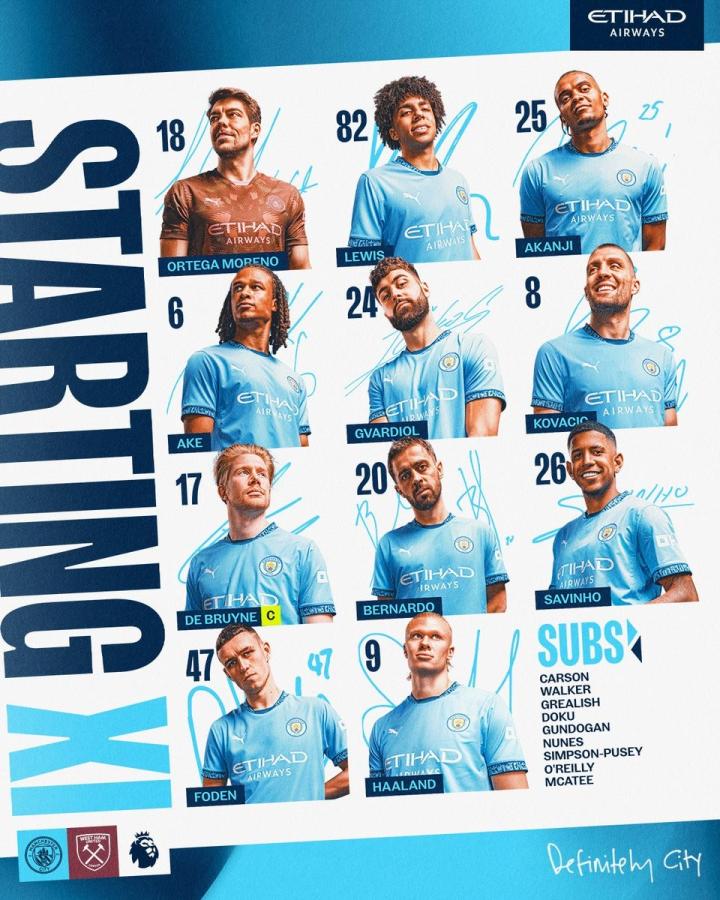 曼城此役首发:哈兰德, 福登, 萨维尼奥, 科瓦契奇, 德布劳内, 伯纳多-席尔瓦, 阿克, 阿坎吉, 格瓦迪奥尔, 里科-刘易斯, 奥尔特加-莫雷诺