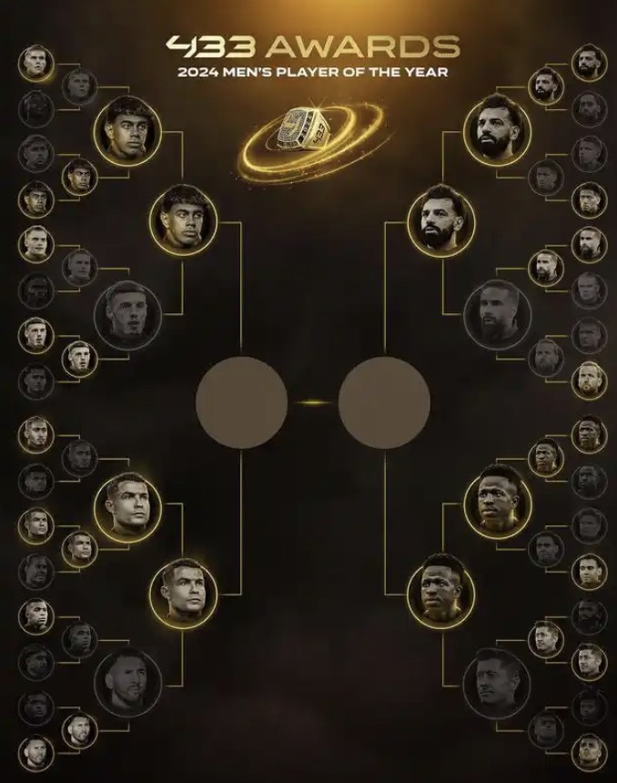 本年度433最佳球员评选共有32名球员入围,通过两两对决的投票形式逐步筛选,C罗一路战胜范戴克、拉菲尼亚、梅西、亚马尔和维尼修斯等出色球员,最终问鼎这一年度荣誉。