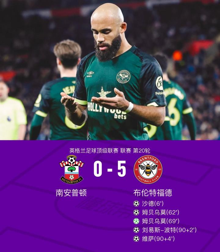 南安普顿0-5惨败布伦特福德,姆贝乌莫双响,维萨传射
