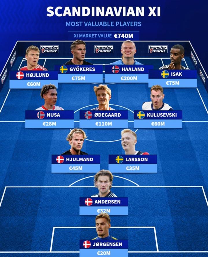 拉斯穆斯-霍伊伦(丹麦/曼联)6000万欧元、哲凯赖什(瑞典/葡萄牙体育)7500万欧元、哈兰德(挪威/曼城)2亿欧元、伊萨克(瑞典/纽卡斯尔联)7500万欧元