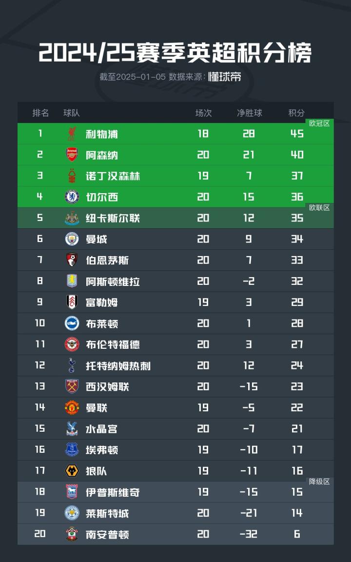 目前,英超前五名分别为利物浦(45分)、阿森纳(40分)、诺丁汉森林(37分)、切尔西(36分)、纽卡斯尔联(35分)。