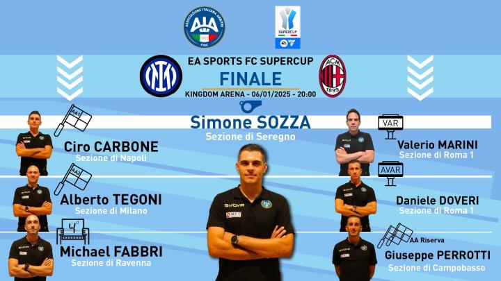 意大利的裁判员协会公布了意大利超级杯决赛国际米兰对阵AC米兰的裁判名单,西蒙尼-索扎将会担任主裁,马里尼出任VAR,多维里担任助理VAR,法布里担任第四官员。